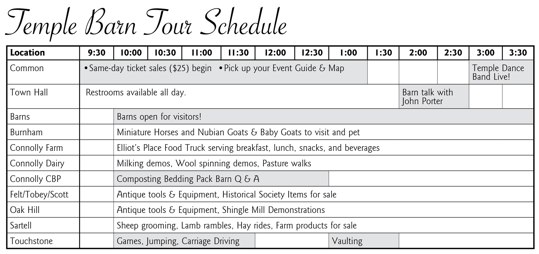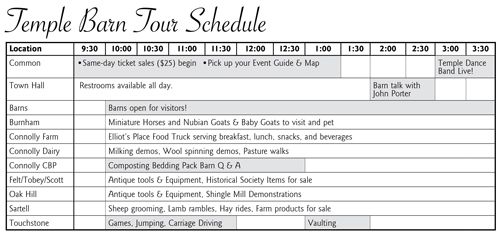 9:30am - 1:30pm - Registration at the tent on the Temple Common. You will receive an Event Guide which will provide directions and information about characteristics and activities at each barn.