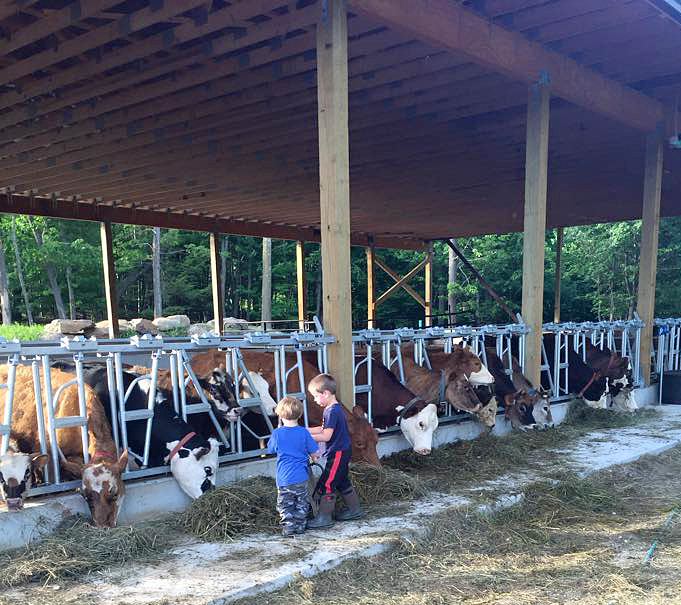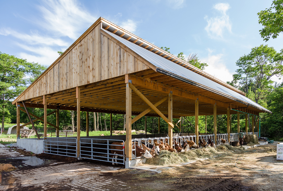 The composting barn provides housing for the family‘s expanding beef herd. It was designed by the Connolly Bros., engineered by Ben Tirey, P.E. of Peterborough, and built by D.A. Builders of Henniker. Building materials were supplied by Belletetes and Wilkins Lumber Co. Connolly Brothers received a grant from USDA Natural Resource Conservation Service (NRCS) to offset some of the costs of the project. The grant was received because the design of the barn is to reduce nutrient runoff by capturing nutrients from manure in compost made in the rear portion of the barn.